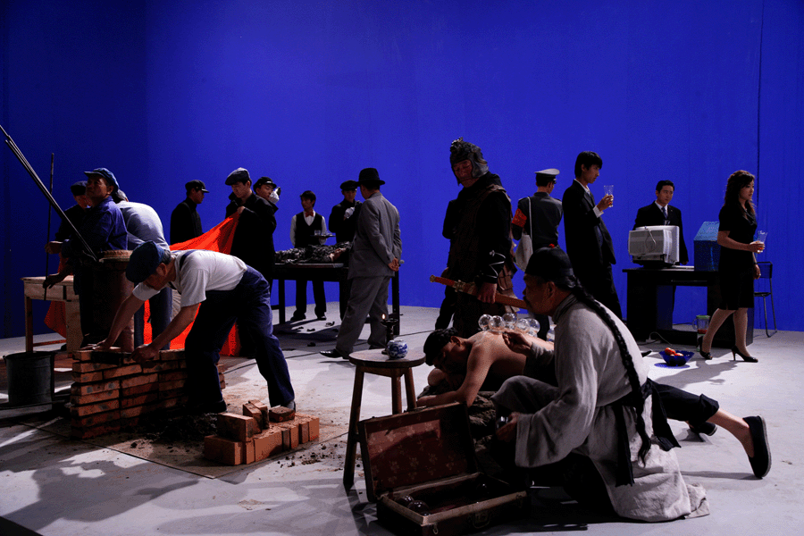 The first part: the ‘virus’ – which is made up of images, devices. (Diagram 1). A public resource is transformed into a visual symbol. The enclosed space simulated by two hair dryers creates a simple ‘artificial environment’ with thousands of white plastic bags moving in the air, forming a new artificial landscape with the theatre’s entrance hall and video.